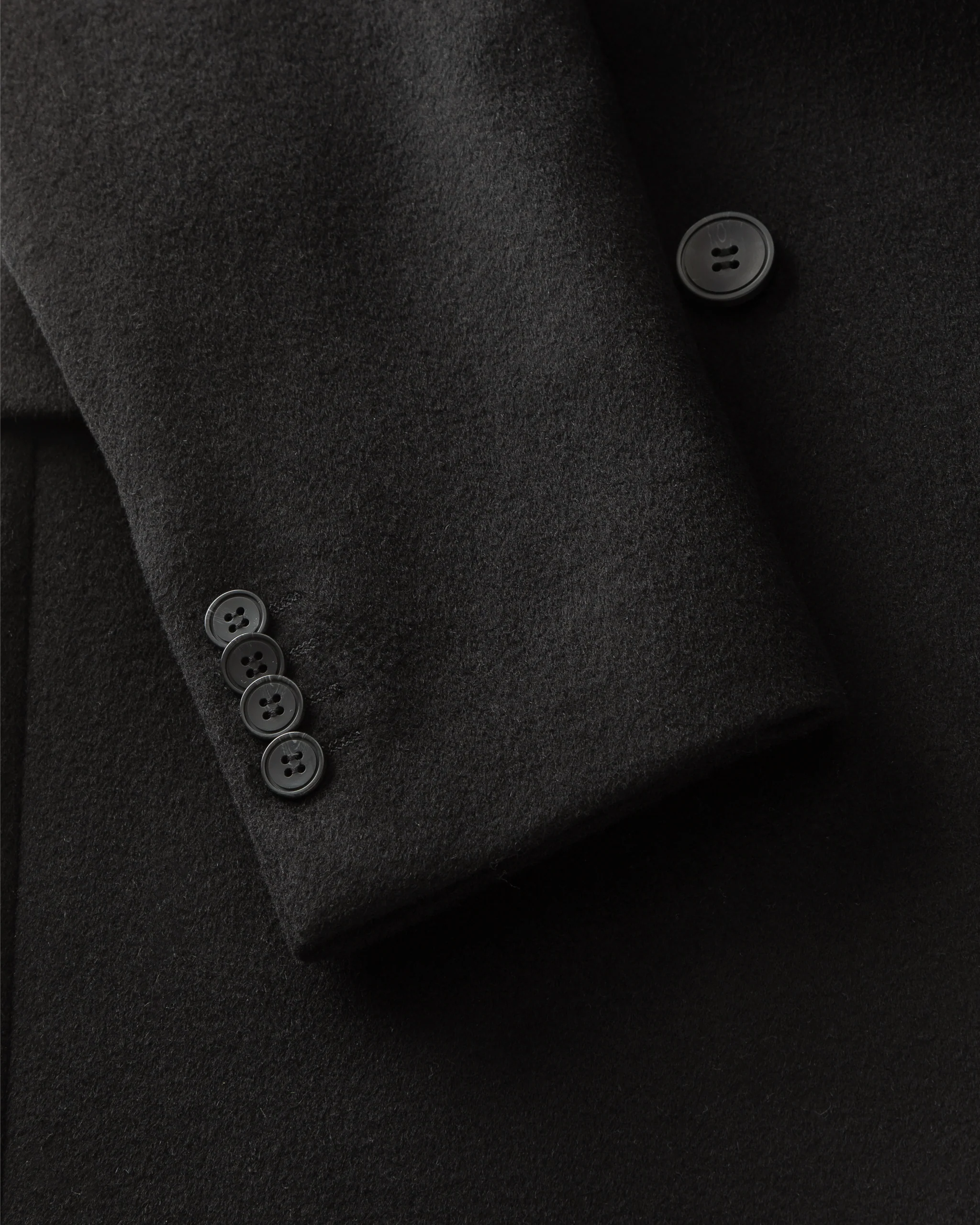 Double-breasted Torino overcoat with staggering black wool fabric. A slender shoulder structure creates a great silhouette for this jacket. Wear it on a suit or a blazer, as well as for a casual outfit. The high-quality woolen fabric has a luxuriously soft feel and an elegant deep black shade.