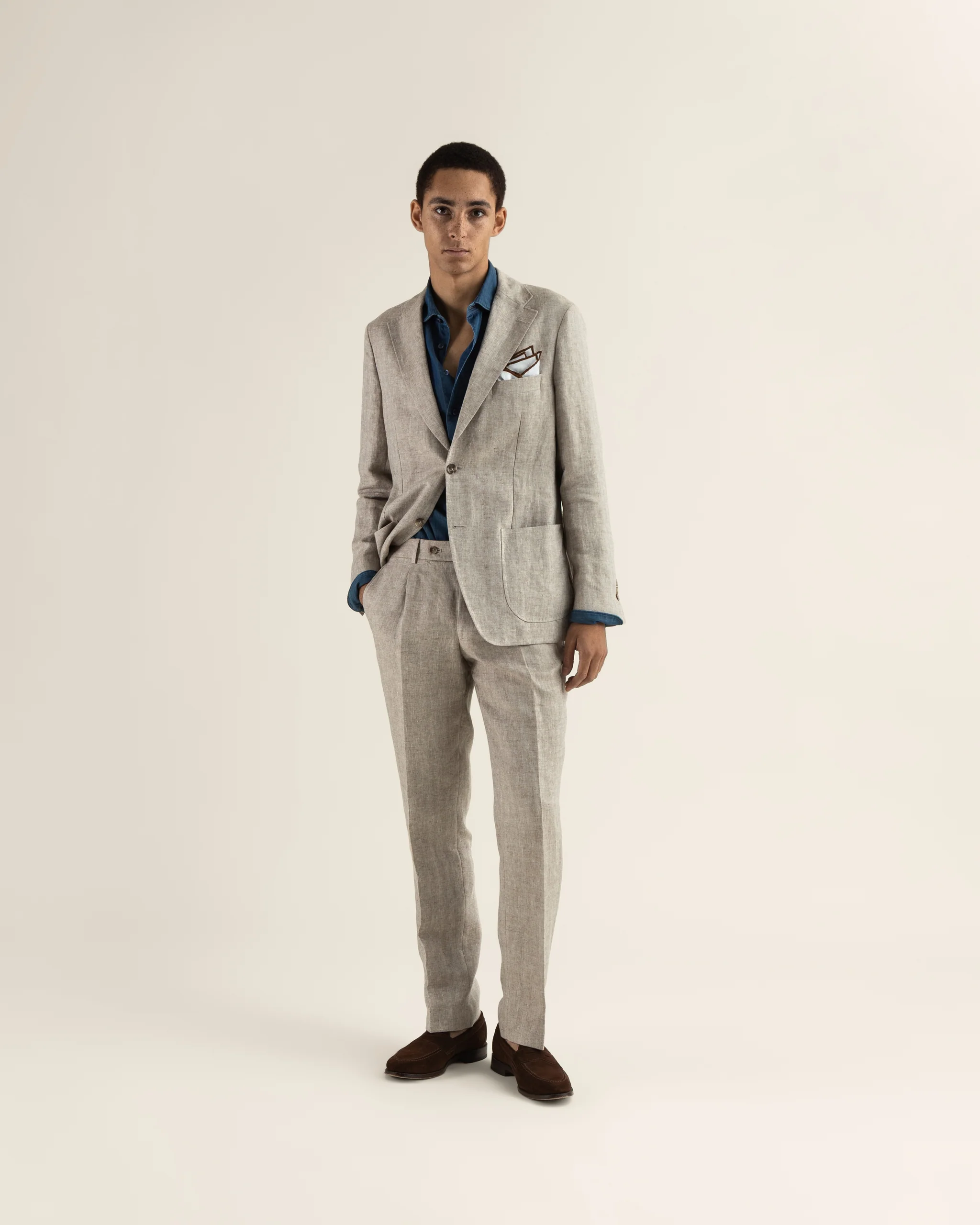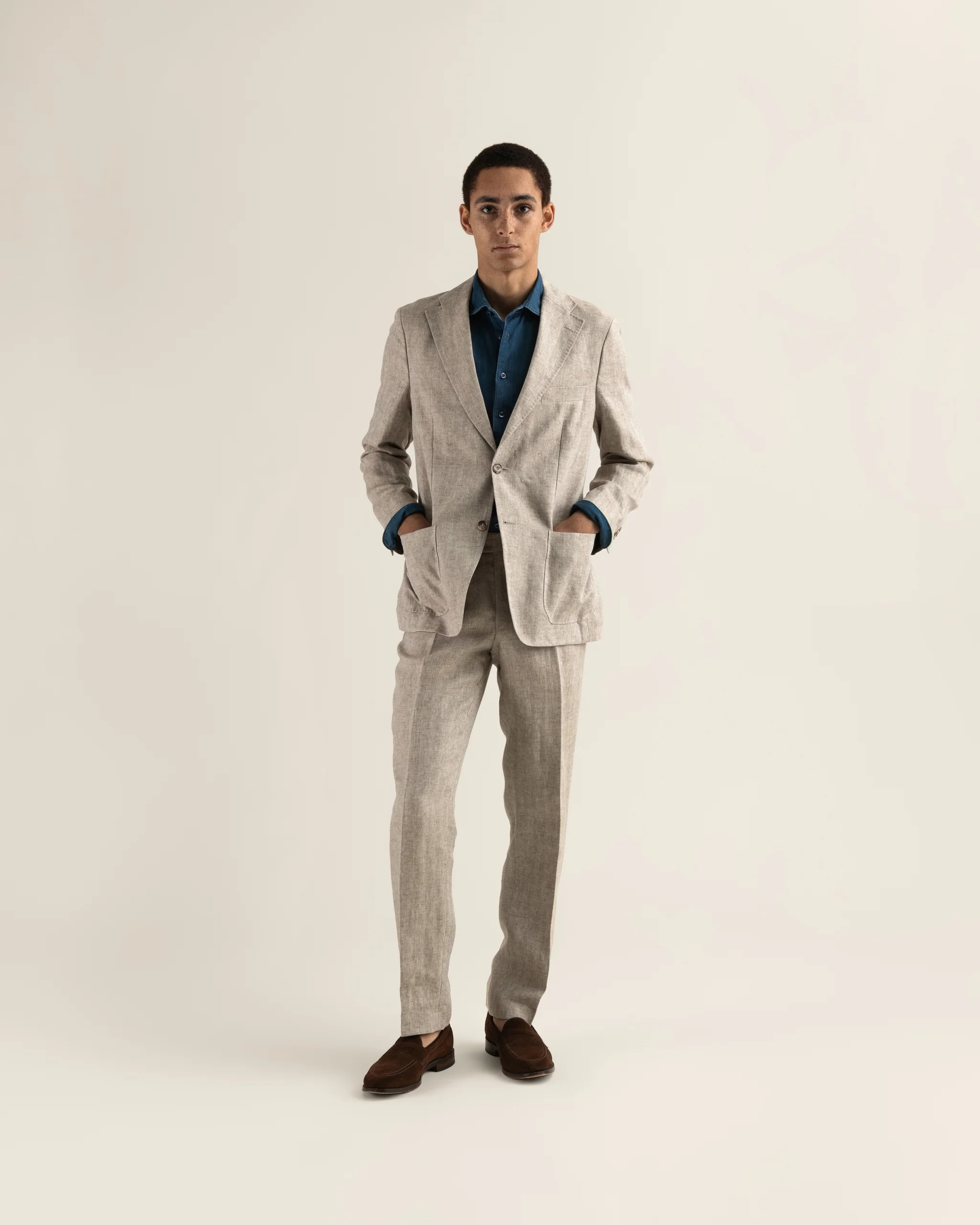 A light summer suit with a relaxed fit. A softly structured jacket can be styled smartly or taken in a more casual direction. Thanks to the wonderful linen fabric created by Angelico, this suit breaths brilliantly despite the slightly warm conditions. You can buy the jacket and trousers separately as well.
