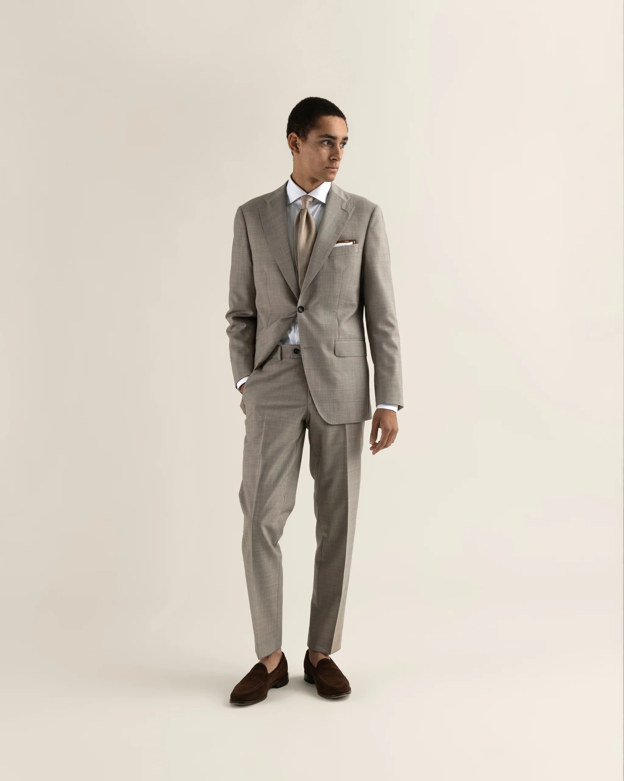 A wonderful summer suit in luxurious Vitale Barberis Canonico wool fabric. Tailored in slim fit. The light sand tone works naturally at the office and for all your spring and summer events. Upgrade the suit to the next level with a matching waistcoat.